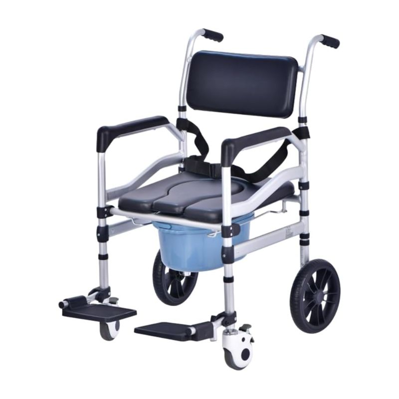 This versatile Bedside Commode Chair combines a raised toilet seat, shower chair, and portable commode, ideal for seniors. Featuring wheels and sturdy handles, it ensures user safety and support. The chair is comfortable, with a soft, easy-to-clean cushion, and adjustable height. Its foldable design allows for easy storage and portability. Made with a sturdy metal frame and anti-slip pads, it offers stability and a safer experience for disabled individuals.