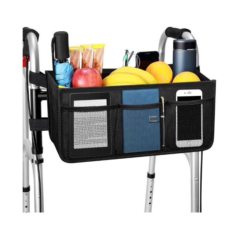 The Dotday Walker Basket measures 16.5″ x 7.4″ x 5.7″ and suits various walkers, though not rollators. Featuring two internal mesh pockets for essentials like iPads and smartphones, it offers convenient storage without the hassle of gaps found in metal baskets. Easy to install with buckles and straps, it ensures stability. Made from water-resistant 600D oxford and nylon fabric, it’s washable and includes elastic bands for securing water bottles. A perfect gift for elderly family members.